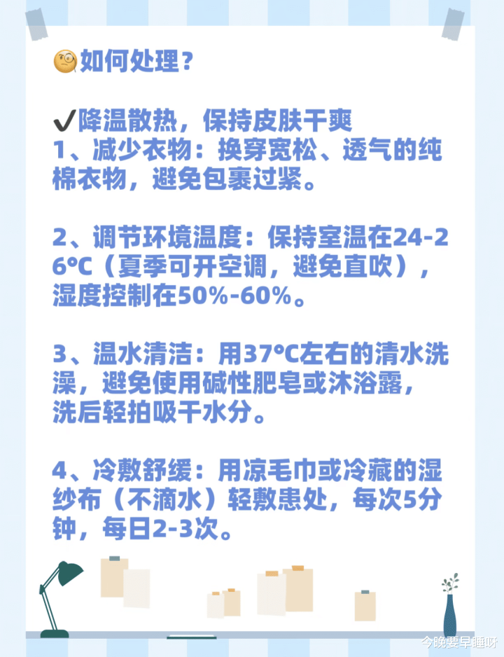 终末,平淡照拂细节也弗成敷衍。宝宝指甲剪短,退守他痒得萧条去抓挠,必要时不错戴上棉质小手套,幸免抓破皮肤引起感染。寝息时多让宝宝趴着或侧着睡,这么背部和臀部的皮肤能透气,减少酷热。要是是母乳喂养,姆妈这段技巧饮食也要属目,辛辣、海鲜这些容易致敏的食品先忍忍,别让宝宝通过乳汁“中招”。