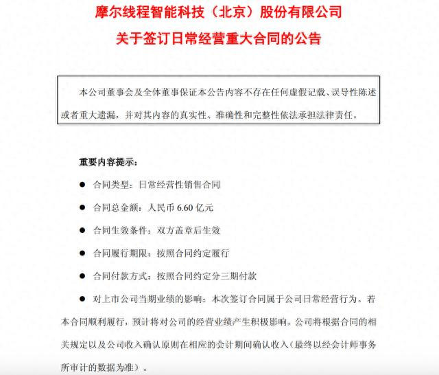 【TechWeb】3月31日讯息,摩尔线程在上交所发布公告称,于近日与某客户缔结了居品销售公约,合同观点为摩尔线程夸娥(KUAE)智算集群,合同总金额为6.6亿元。