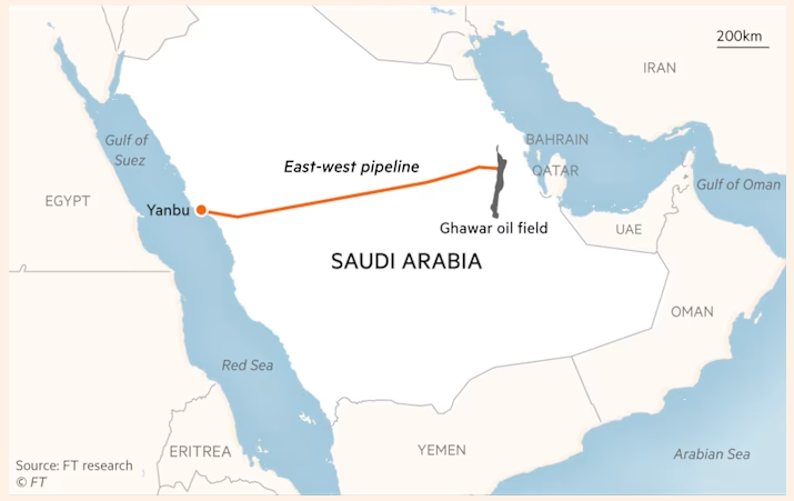 延布港通过一协议1200公里长的管谈与沙特东部产油区连结,这使得石油运载无需经过霍尔木兹海峡。